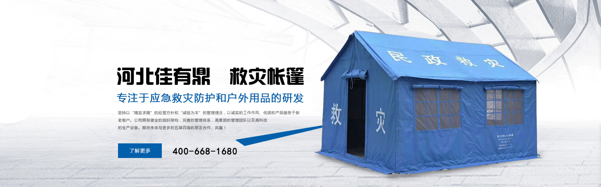 河北佳有鼎科技有限公司原為北京五環(huán)精誠帳篷有限責任公司多年來專注于應急救災防護和戶外用品的研發(fā),是一家集研發(fā)、設計、生產、銷售、服務于一體的綜合型公司。